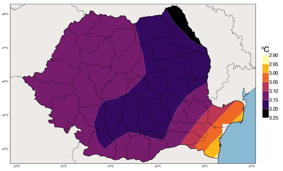 Creșterea proiectată a temperaturilor în România. Orizont - 2070