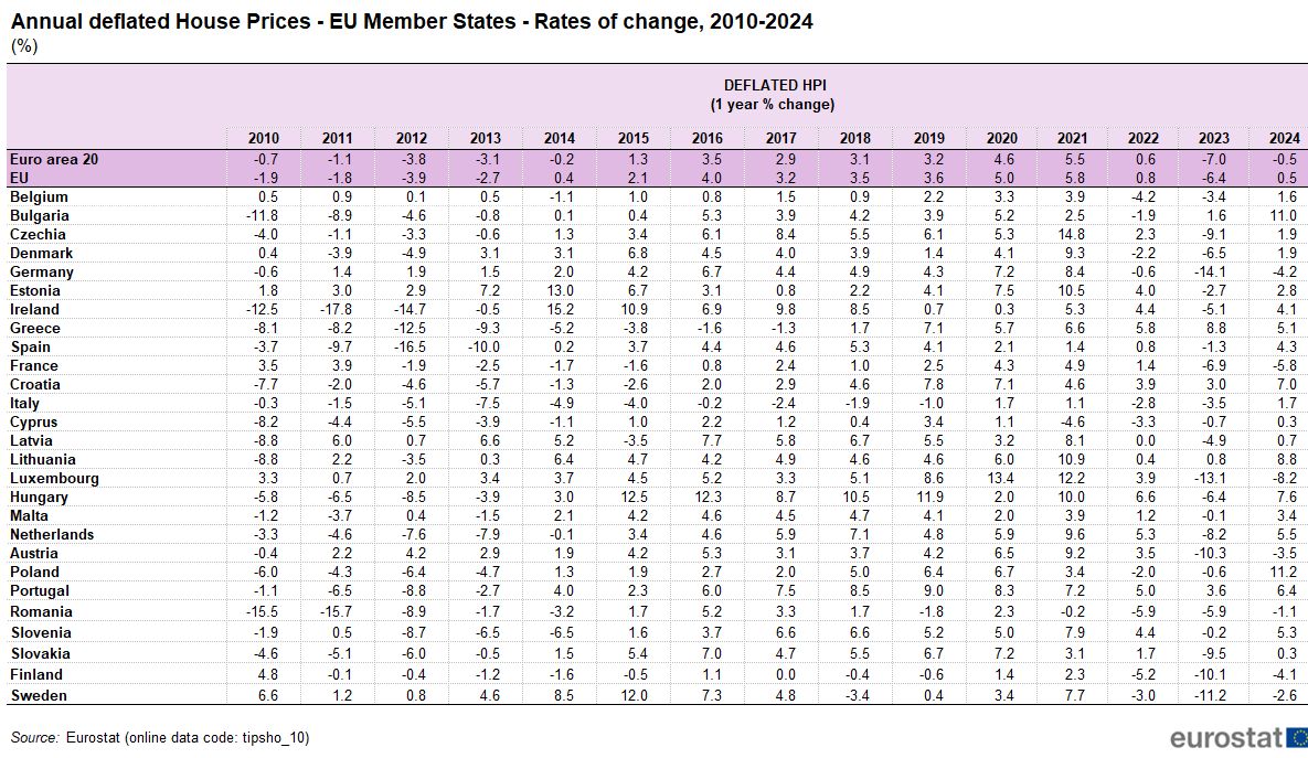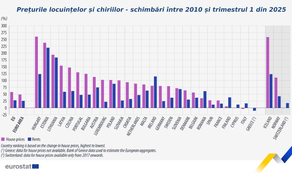 Dintre țările UE pentru care sunt disponibile date, una a înregistrat o scădere anuală a prețurilor locuințelor în primul trimestru din 2025, iar 25 au înregistrat creșteri anuale. Scăderea s-a înregistrat în Finlanda (-1,9%), în timp ce cele mai mari creșteri au fost consemnate în Portugalia (+16,3%), Bulgaria (+15,1%) și Croația (+13,1%).