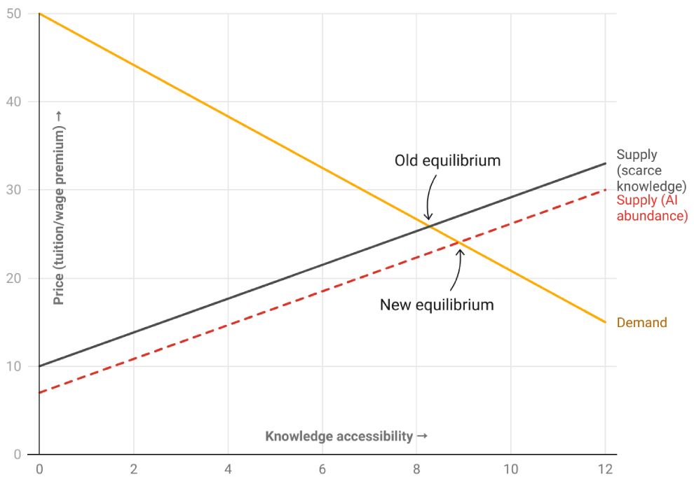 Modelele lingvistice de mari dimensiuni nu doar accesează fapte; ele explică, traduc, rezumă și redactează aproape instantaneu. Când oferta explodează în acest fel, economia spune că prețul scade. Așadar, „cunoașterea premium” pe care universitățile o vindeau de mult timp își pierde valoarea.