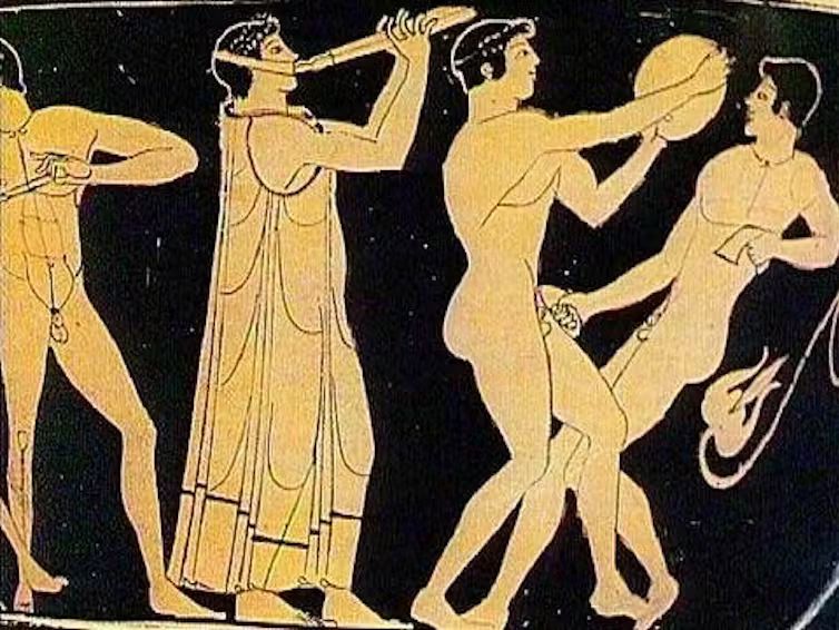 Pe un vas din secolul al V-lea î.Hr., un grup de atleți se antrenează în timp ce un muzician cântă la „aulos”, un instrument cu ancie asemănător unui fluier dublu.