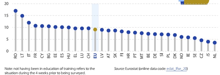 Probabil o consecință a celor de mai sus, România este pe prima poziție și când vine vorba de tinerii cu vârstă de liceu și facultate/ master (15-24 de ani) care nu se regăsesc nici în sistemul de educație, nici în câmpul muncii.