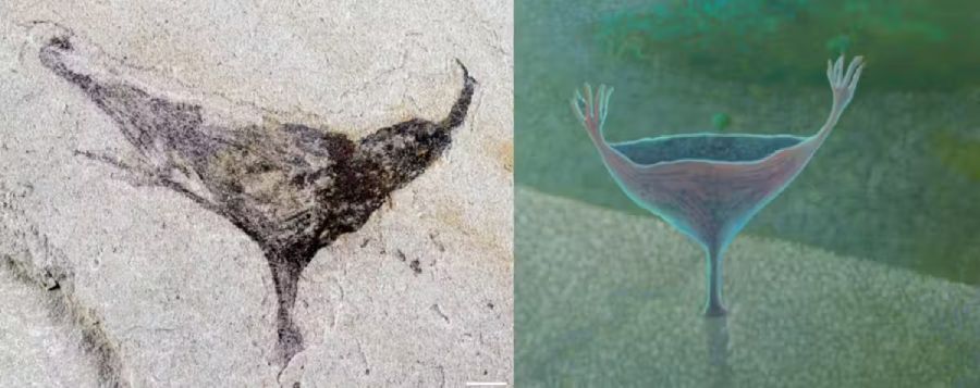 Această fosilă (împreună cu reconstrucția artistică), descoperită în biota Jiangchuan (~554–539 mya), este un cnidarian timpuriu: încrengătura care include meduzele, anemonele de mare și coralii. Bara de scară: 2 mm.