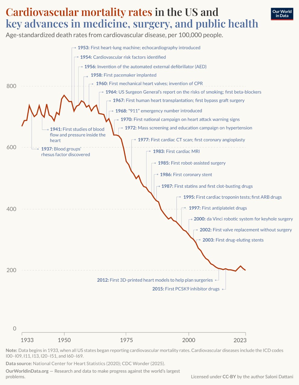 Doar în Statele Unite, rata deceselor standardizată pe vârstă cauzate de boli cardiovasculare a scăzut cu trei sferturi din 1950 încoace. Asta înseamnă că, pentru persoane de aceeași vârstă, riscul anual de a muri din cauza unei boli cardiovasculare este acum de doar un sfert față de cel din 1950.