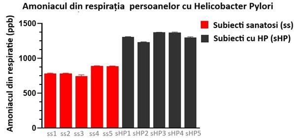 Analizând rezultatele obtinute, concentrația medie de amoniac/zi pentru participanții sănătoși a fost: ss1 - 781 ppb, ss2 - 780 ppb, ss3 - 754 ppb, ss4 - 891 ppb și ss5 - 889 ppb. Pentru participanții infectați cu H. pylori, concentrațiile medii au fost: sHP1 - 1308 ppb, sHP2 - 1233 ppb, sHP3 - 1373 ppb, sHP4 - 1370 ppb și sHP5 - 1300 ppb.
