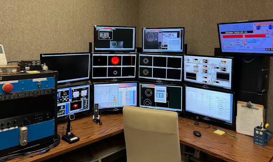 Camera de control Texas Petawatt permite cercetătorilor să urmărească o varietate de parametri și indicatori. În stânga se află butonul mare roșu de oprire de urgență.