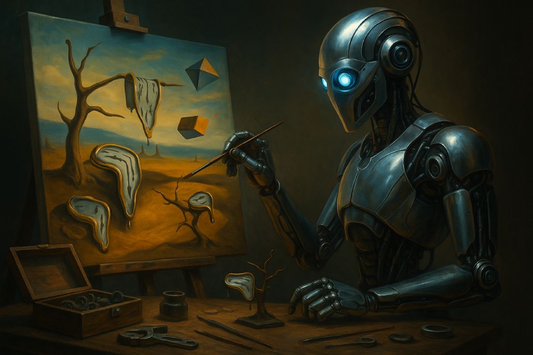 A humanoid AI robot with a sleek chrome body and glowing blue eyes is painting a surrealist landscape in the style of Salvador Dalí. The canvas shows a dreamlike desert with melting clocks hanging from twisted metal trees, and floating geometric shapes in the sky. The robot holds a delicate brush, lost in concentration, surrounded by scattered mechanical tools and surreal models. The atmosphere is eerie and imaginative, blending futuristic technology with classic surrealism. Ultra-detailed, cinematic lighting, 900x500px.