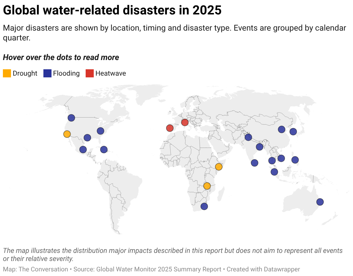 În spatele acestor dezastre se află o influență mai profundă și mai puțin vizibilă: schimbările continue ale ciclului global al apei. Acesta este procesul prin care apa se evaporă, cade sub formă de ploaie sau zăpadă și apoi se evaporă din nou. Cel mai recent raport al nostru arată cum modificările temperaturii aerului, umidității și precipitațiilor s-au combinat pentru a amplifica dezastrele legate de apă în 2025.