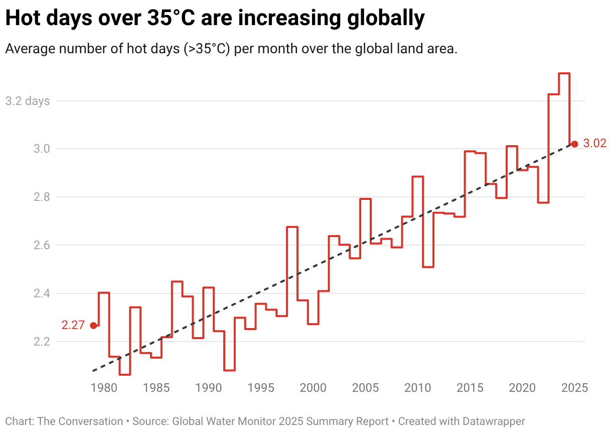 Temperaturile globale de pe uscat în 2025 au fost doar ușor sub cele din 2024, un an record, confirmând cei mai fierbinți trei ani din istorie. Temperaturile mai ridicate accelerează evaporarea din sol, vegetație și ape interioare, iar aerul mai cald poate reține mai multă umiditate, crescând potențialul pentru ploi intense. Împreună, aceste procese intensifică atât inundațiile, cât și secetele.