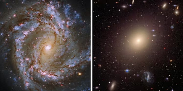 În stânga, cum arată o galaxie tânără tipică arată astăzi. Calea Lactee arată similar, cu brațe în spirală. Dar Calea Lactee poate evolua într-o galaxie eliptică, masivă, ca cea din imaginea din dreapta.