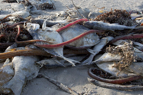 Peşti morţi eşuaţi pe o plajă din Insula Padre, Texas, în octombrie 2009, din cauza unei maree roşii (înflorire de alge dăunătoare)