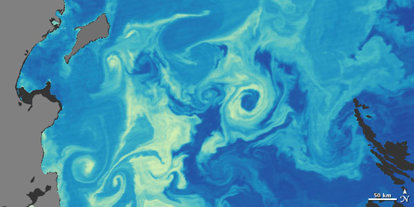 În imaginile cu culori naturale ale sateliţilor, fitoplanctonul apare ca vârtejuri colorate. Oamenii de ştiinţă folosesc aceste observaţii pentru a estima concentraţia de clorofilă din apă. Aceste imagini arată o înflorire lângă Kamtchatka de la data de 2 iunie 2010. (Imagini de Robert Simmon şi Jesse Allen).