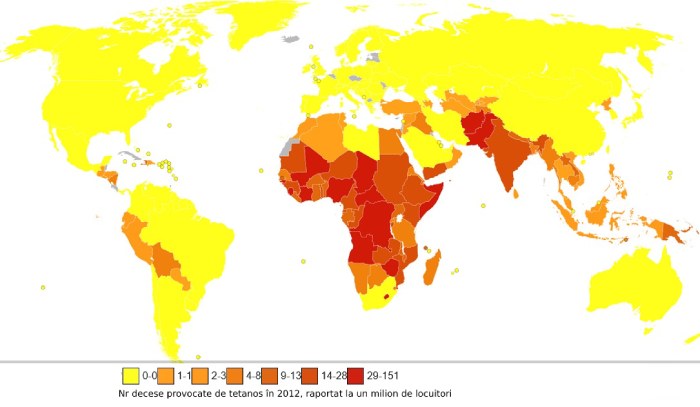 Infecția poate fi prevenită printr-o imunizare adecvată cu vaccinul antitetanos. Tetanosul este o boală cu o incidenţă extrem de scăzută în Europa, dar cu incidenţă mare în Africa şi sudul Asiei, după cum puteţi vedea în imaginea de mai sus.