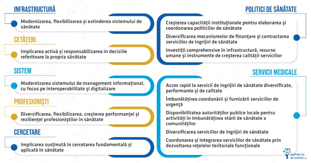 În actul normativ se arată că „România își asumă prin SNS 2022 – 2030, intenția fermă de a implementa reforme structurale susținute ale sistemului de sănătate”. În mod special, acestea vizează: