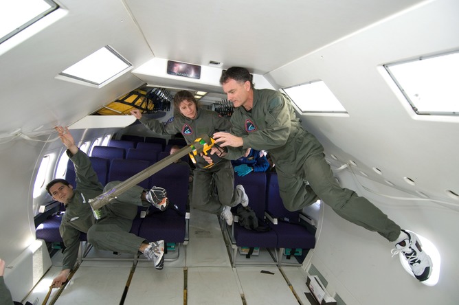 Autorii articolului în interiorul "Vomit Comet", unde sunt recreate, pe Terra, condiţii de gravitaţie zero