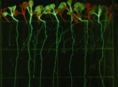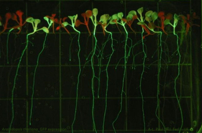 Plante Arabidopsis modificate. Culoarea verde arată unde proteina fluorescentă verde este activată, iar culoare roşie arată fluorescenţa naturală a clorofilei.