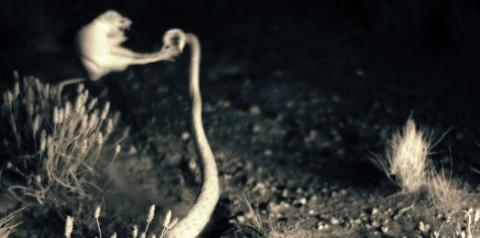 Șobolanul-cangur înlăturând un șarpe care atacă printr-o lovitură de picior