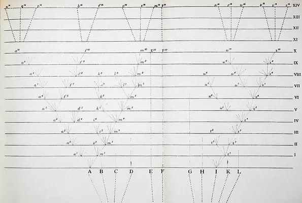 Singura diagramă din „Originea speciilor”, cartea lui Darwin, arată cum speciile se diferențiază în timp. Dacă apar mai mai multe specii decât dispar, atunci bogăția speciilor crește. Darwin s-a întrebat dacă spațiul ecologic ar putea fi „complet” într-o zi.