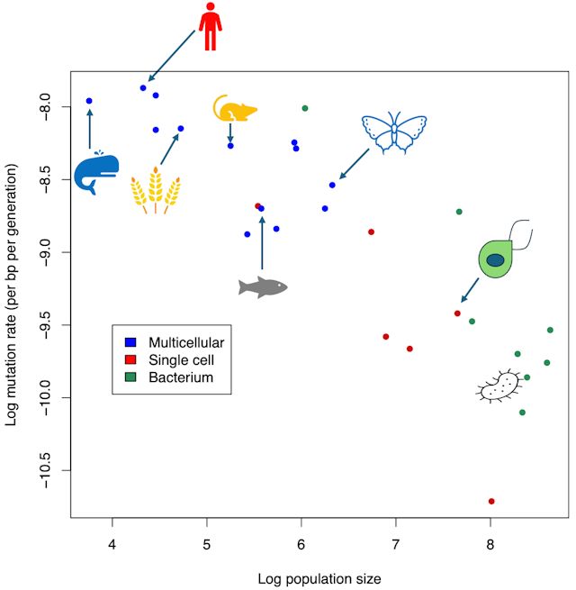 Rata de mutație (per pereche de baze pe generație) este mai mare când dimensiunea populației este mai mică, așa cum prevede modelul aproape-neutru al evoluției.