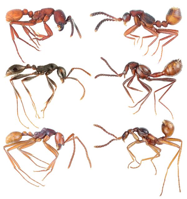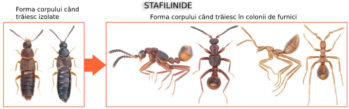 În imaginea de mai sus puteți vedea, în coloana din stânga, 3 specii de furnici (Nomamyrmex, Aenictus și Neivamyrmex), iar în coloana din dreapta 3 specii de stafilinide (Ecitocryptus, Giraffaenictus și Diploeciton).