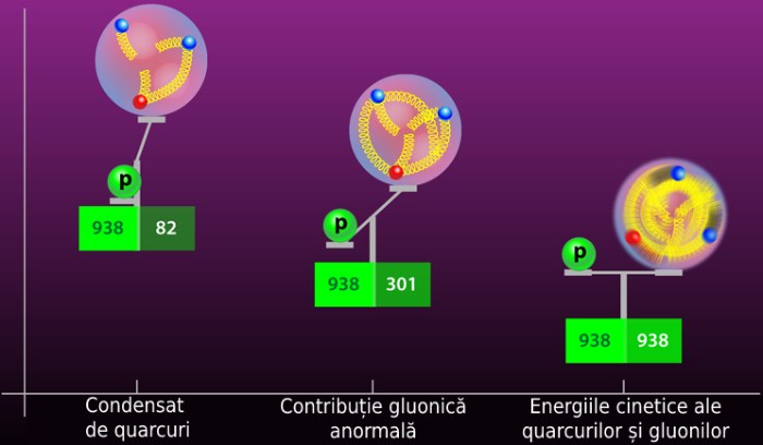 Într-un studiu din 2018 cercetătorii au calculat masa protonului, pe baza a patru surse: condensat de quarkuri (9 %), energia cinetică a quarkurilor (32 %), energia cinetică a gluonilor (36 %) și „contribuția gluonică anormală” (23 %).