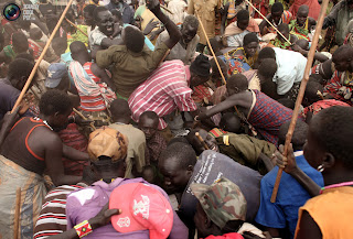 2 aprilie, Sudan: Băştinaşi din tribul Dadinga se luptă pentru mâncarea distribuită în zonă prin World Food Program.