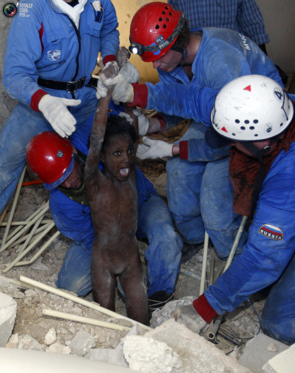 16 ianuarie, Port-au-Prince, Haiti: O fetiţă este salvată dintre ruinele casei în care a fost surprinsă de cutremur.