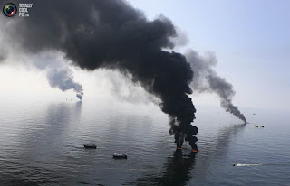 13 iunie, coaste Louisianei: Fumul este produs de un incendiu controlat a petrolului scurs în Golful Mexic.