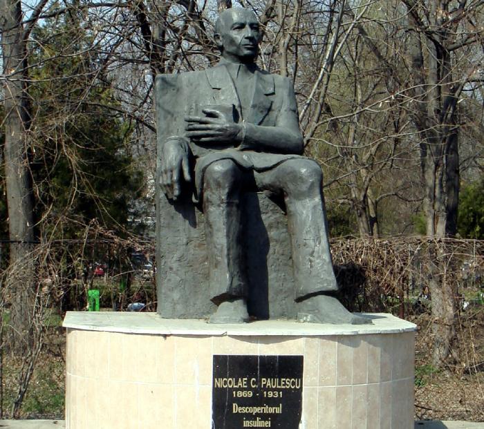 Statuia lui Nicolae Paulescu de lângă Facultatea de Medicină din București, dezvelită la 31 august 2001