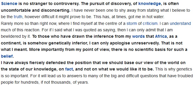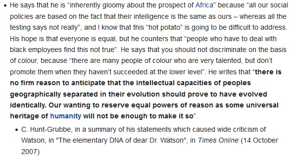E cam greu să fii complet de acord cu afirmațiile lui Watson. E mai ușor să demonstrezi că sărăcia și poziția geografică au un impact mai mare asupra performanțelor inițiale ale unui individ, decât are inteligența nativă. Pe de altă parte, e la fel de greu să demonstrezi că rasa e un „construct social” și că nu există diferențe între rase, când zeci de dovezi îți vor demonstra contrariul. E suficient să te uiți la transplanturile de organe și în mod special la cele de măduvă osoasă. Sigur, am putea vorbi toată ziua despre antigenii-HLA, dar ideea e alta: rasele există, chiar dacă nu există vreo dovadă că abilitățile lor intelectuale ar fi diferite. Studiile citate de Watson e posibil să fie niște porcării, dar ele nu pot fi demolate doar pe baza faptului că unora nu le place conceptul de rasă. Știința nu e corectă politic. Din fericire!