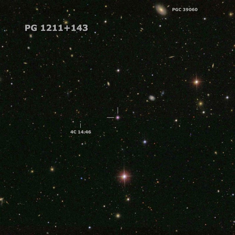 Quasarul PG 1211+143 marcat în centrul imaginii. Credit: SDSS/S. Karge