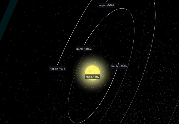 Sistemul solar Kepler-107 conţine patru planete, care au fost descoperite de către telescopul spaţial Kepler (de aici şi numele) prin observarea variaţiei luminozităţii stelei în urma tranzitului planetelor prin faţa acesteia. Acest gen de observaţii permit inclusiv determinarea dimensiunii acestor planete.