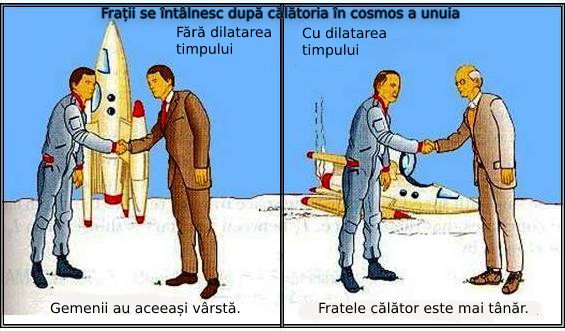 Există şi un paradox faimos, cel al gemenilor, în care unul dintre fraţi pleacă într-o călătorie spaţială, iar celălalt rămâne acasă. La întoarcere cei doi au vârste diferite. Paradoxul are o soluţie unică şi elegantă în cadrul relativităţii generale. În cadrul acestei teorii fratele care a călătorit, pentru a reuşi să se întoarcă acasă, este supus unor acceleraţii intense (echivalente cu câmpuri gravitaţionale intense), cei doi fraţi fiind deci supuşi la condiţii diferite de acceleraţie. Ei bine, cel care a accelerat va fi mai tânăr; la întâlnire, depinzând de acceleraţia la care a fost supus, fratele călător ar putea fi mult mai tânăr ca cel rămas acasă.