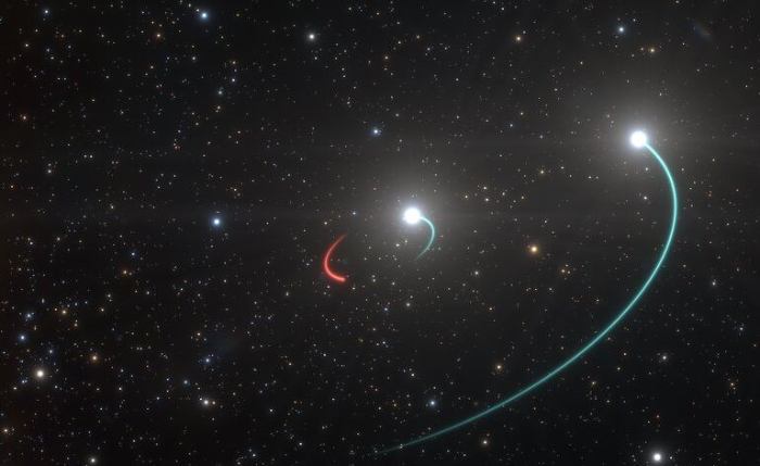 Sistemul triplu HR 6819, format dintr-o stea (orbita în albastru), o gaură neagră (orbita indicată în roșu) și, la depărtare, o altă stea (orbita în albastru)