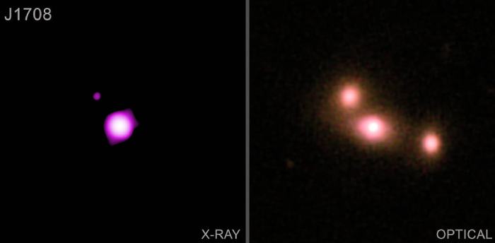 Au fost observate o serie de coliziuni de trei galaxii, fiecare cu propria gaură neagră enormă; ce se întâmplă cu aceste găuri negre atunci când galaxiile se ciocnesc? La această întrebare, care are efecte inclusiv asupra studiilor asupra undelor gravitaționale, a răspuns un grup de cercetători care a studiat razele X măsurate de observatorul Chandra (NASA).