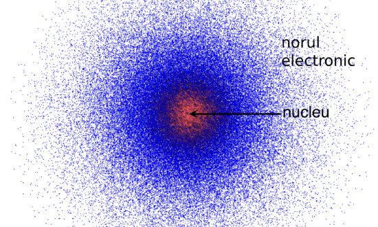Reprezentarea unui atom, cu nucleul în centru, iar electronii distribuiți în jurul acestuia