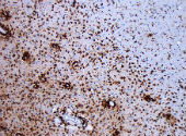 Demielinizare în scleroza multiplă. ţesutul colorat cu CD68 arată mai multe macrofage la nivelul leziunii. Scala originală 1:100.