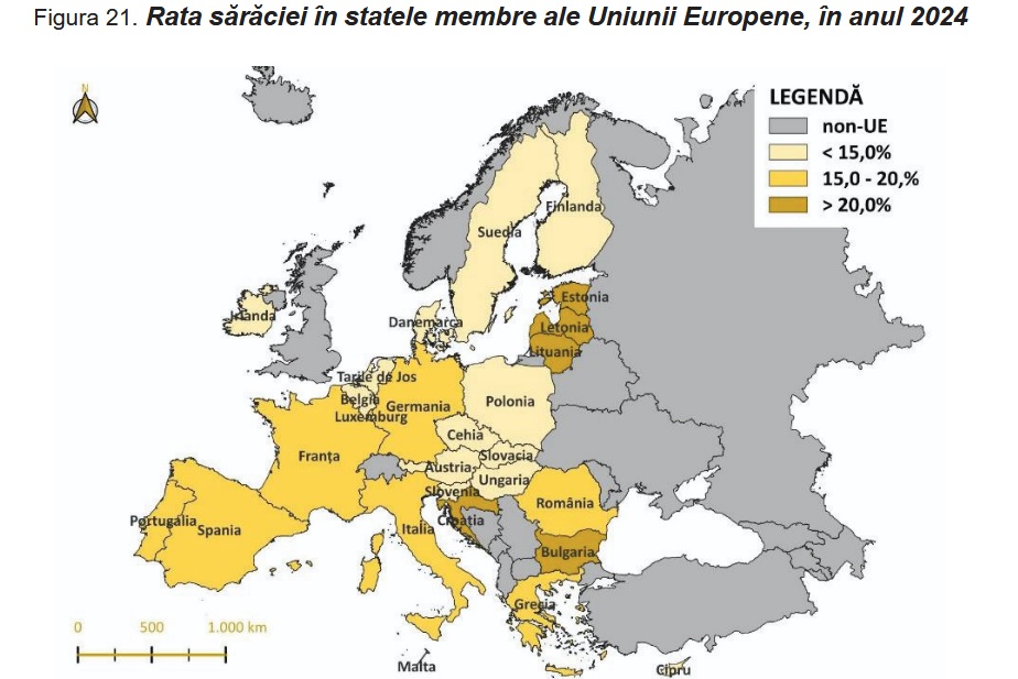 Din punct de vedere al ratei sărăciei relative, România (cu 19,0%) se plasa în anul 2024 în grupul statelor relativ sărace, cu valori peste media Uniunii Europene (16,2%), cum ar fi: Bulgaria (21,7%), Letonia (21,6%), Lituania (21,5%), Croația (20,3%) și Estonia (20,2%).