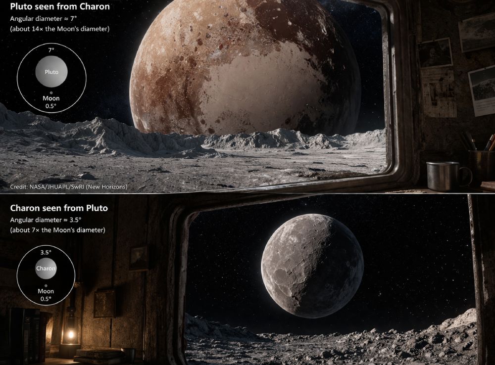 Situația este și mai spectaculoasă pe Charon. Privit de pe fereastra ta din apartamentul tău ipotetic de pe Charon, Pluto ar avea un diametru aparent de ~7°, adică de 14 ori Luna cât al Lunii, ceea ce înseamnă că domină complet cerul lui Charon.