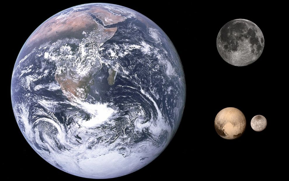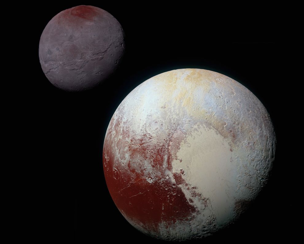 Pluto și cel mai mare satelit al său, Charon. Această imagine, combinată, a lui Pluto (dreapta jos) și Charon (stânga sus) a fost făcută cu ajutorul sondei spațiale New Horizons a NASA în timpul trecerii prin sistemul lui Pluto, la 14 iulie 2015. Culoarea și luminozitatea ambelor corpuri au fost procesate în mod identic pentru a permite compararea directă a suprafețelor lor și pentru a evidenția asemănarea dintre regiunea polară roșiatică a lui Charon și regiunea ecuatorială roșiatică a lui Pluto. Pluto și Charon sunt prezentate cu dimensiuni relative aproximativ corecte, însă distanța reală dintre ele nu este reprezentată la scară.