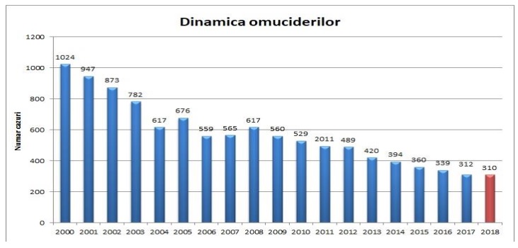 În anul 2018 au fost înregistrate 310 omucideri, numărul fiind cel mai mic din anul 2000, când au fost 1.024 de omucideri.