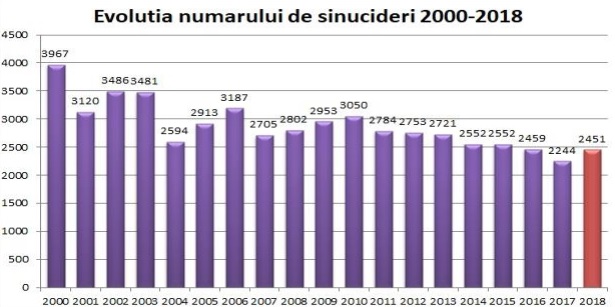 În anul 2018 numărul de sinucideri a fost de 2.451, în creştere faţă de anul 2017, când au fost 2.244. După anul 2003, cu evoluţii de la an la an, numărul de sinucideri este între 2.244 (numărul cel mai mic din ultimii 18 ani) şi 3.187 (în 2006).