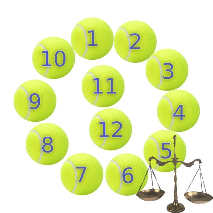 Provocarea este următoarea: aveți 12 mingi de tenis care arată identic, ca în imaginea de mai sus, dar una dintre ele are o masă diferită, este un pic mai ușoară ori mai grea decât celelalte 11 mingi. Aflați care este mingea diferită și spuneți dacă este mai grea ori mai ușoară decât celelalte mingi, folosind o balanță pe care o aveți la îndemână și pe care o puteți folosi pentru a compara mingile. Aveți dreptul la maximum trei folosiri ale balanței.