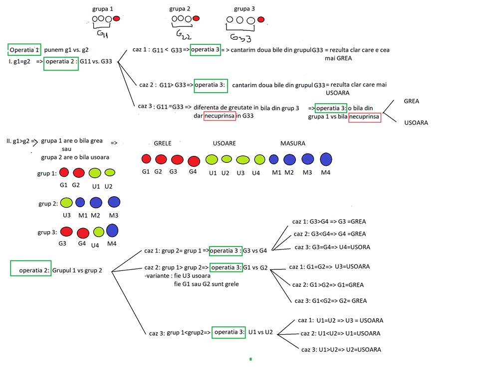 1.Dacă balanţa este echilibrată când verificăm 1-4 vs 5-8, cu siguranţă una din mingile 9-12 este cu diferenţa de greutate.