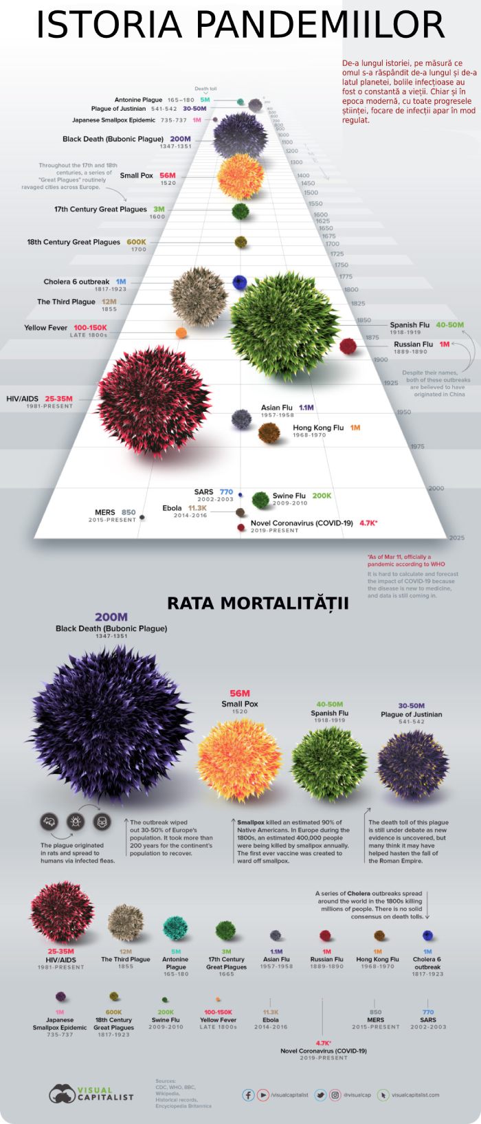 Iată mai jos un infografic care trece în revistă istoria pandemiilor.