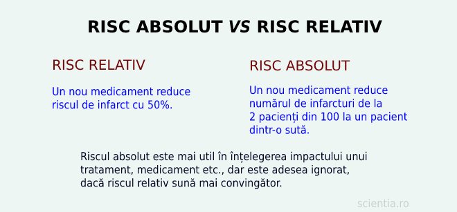 Pentru a vedea de ce e importantă înțelegerea diferenței dintre cele două moduri de exprimare a riscului, să luăm în considerare exemplul ipotetic al unui medicament care reduce riscul de atac de cord cu 40%. Imaginează-ți că dintr-un grup de 1.000 de persoane care nu au luat noul medicament, 10 ar avea atacuri de cord. Riscul absolut este de 10 din 1.000 sau 1%. Dacă un grup similar de 1.000 de persoane ar lua medicamentul, numărul de atacuri de cord ar fi de șase. Cu alte cuvinte, medicamentul ar putea preveni patru din zece atacuri de cord - o reducere a riscului relativ de 40%. Între timp, riscul absolut a scăzut doar de la 1% la 0,6% - dar scăderea riscului relativ de 40% sună mult mai convingător.