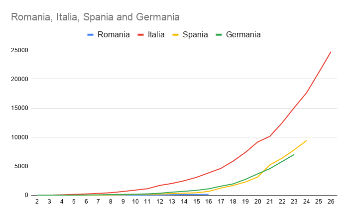 În graficul de mai sus puteți vedea o privire comparativă a evoluției epidemiei COVID-19 în România și în cele trei țări europene cele mai afectate: Italia, Spania și Germania.