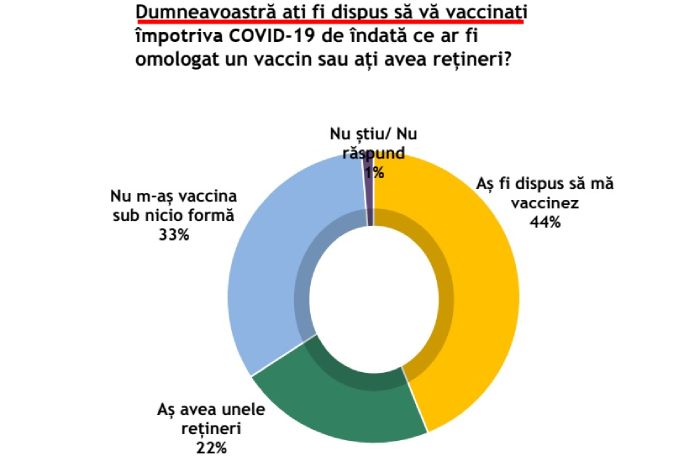 Dar mai este un aspect interesant: nu există o diferență foarte mare între cei care au nivel de educație scăzut și înalt (50% vs 44%), Așadar, cei cu educație scăzută sunt mai dispuși la a se vaccina! Asta trebuie să fie un pic surprinzător, pentru că de regulă argumentul pe care-l folosim atunci când auzim că unii se opun vaccinării se referă la lipsa de educație. Sigur, una este educația formală, terminarea unei facultăți, alta este înțelegerea modului în care funcționează vaccinurile. Procentele se echilibrează un pic atunci luăm în calcul și răspunsul al doilea: „aș avea unele rețineri”. Cei mai educați sunt, probabil natural, un pic mai sceptici.