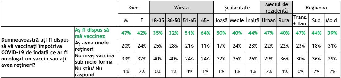 Dacă evaluăm răspunsurile celor două categorii de vârstă care prezintă un risc mai mare de complicații în cazul contactării virusului SARS-CoV-2, 72% dintre românii cu vârsta între 51 și 65 de ani sunt dispuși să se vaccineze, unii cu unele rețineri, precum și 75% dintre cei cu vârste mai mari de 65 de ani.