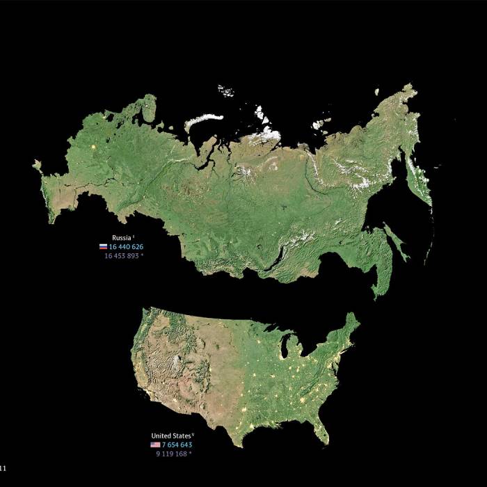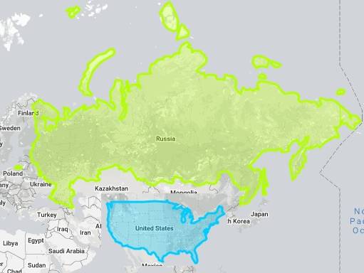 Pentru a înțelege mai bine diferența dintre harta obișnuită a lumii și raportul real dintre suprafețele țărilor, iată o comparație între Rusia și SUA. Întâi, raportul real al dimensiunilor țărilor, apoi raportul dintre acestea, așa cum apare pe harta lumii.