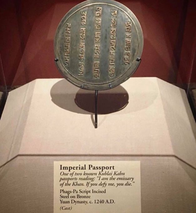 4. Acum 800 de ani se vorbea scurt și clar... „Pașaportul” imperial al hanului Kublai (han mongol care a trăit între anii 1215-1294, fiind unul din nepoții întemeietorului Imperiului mongol, Ginghis Han), moneda din imaginea de mai jos, menționa: „Sunt trimisul hanului. Dacă mă provoci, mori”.